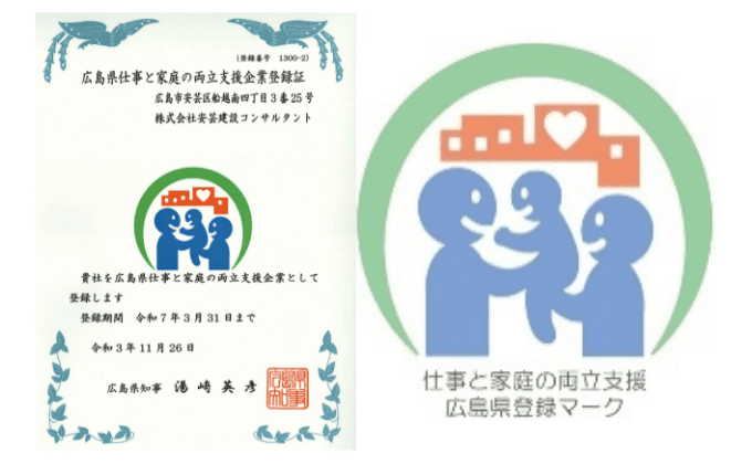 株式会社安芸建設コンサルタントは、「広島県仕事と家庭の両立支援企業登録制度」仕事と子育ての両立や働き方の見直しなど支援に取り組むこと企業として登録しました。次世代支援対策推進法に基づき「一般事業主行動計画」を策定し、子育てを行う社員の仕事と家庭の両立を支援するための制度や、働きやすい環境をつくることによって、男女問わず全ての社員がその能力を最大限に発揮できるように、雇用環境、職場環境の整備に取り組んでいます。